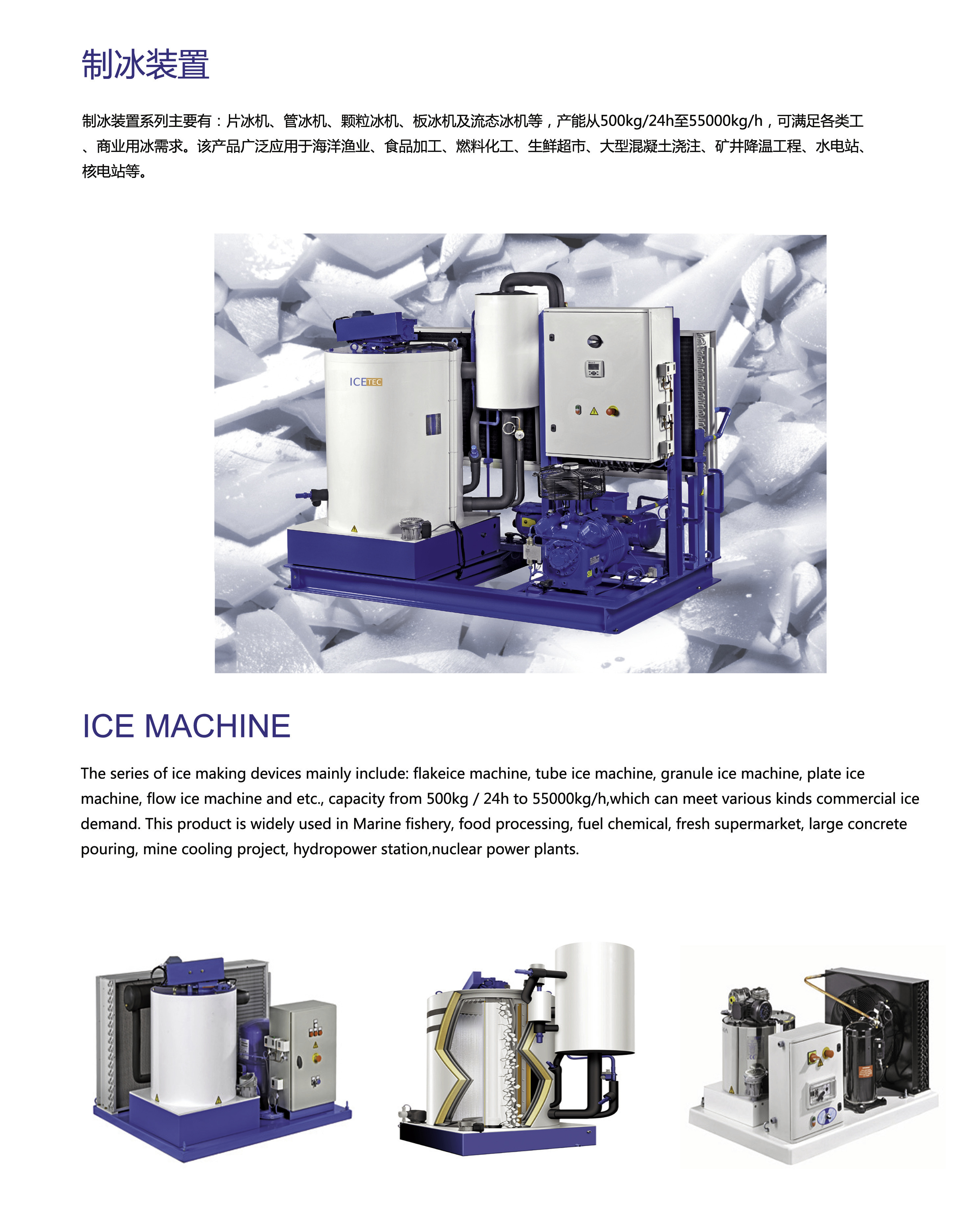 制(zhì)冰裝置系列主要有(yǒu):片冰機、管冰機、顆粒冰機、闆冰機及流态冰機等,産能(néng)從500kg/24h至55000kg/h,可(kě)滿足各類工(gōng)商業(yè)用(yòng)冰需求。該産品廣泛應用(yòng)于海(hǎi)洋漁業(yè)、食品加工(gōng)、燃料化工(gōng)、生鮮超市、大(dà)型混凝土(tǔ)澆注、礦井降溫工(gōng)程、水(shuǐ)電站核電站等。