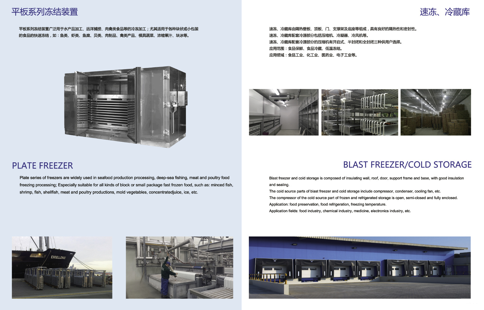 平闆系列凍結裝置廣泛用(yòng)于水(shuǐ)産品加工(gōng)、遠洋捕撈、肉禽類食品等的(de)冷(lěng)凍加工(gōng);尤其适用(yòng)于各種塊狀或小(xiǎo)包裝的(de)食品的(de)快速凍結,如(rú):魚類、蝦類、魚糜、貝類、肉制(zhì)品、禽類産品、模具蔬菜、濃縮果汁、塊冰等。